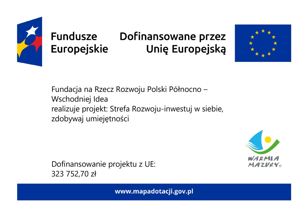 Fundacja na Rzecz Rozwoju Polski Północno-Wschodniej IDEA realizuje projekt „Strefa Rozwoju – inwestuj w siebie, zdobywaj umiejętności”, współfinansowany ze środków Unii Europejskiej w ramach programu Fundusze Europejskie dla Warmii i Mazur 2021–2027, Priorytet 6: Edukacja i kompetencje EFS+, Działanie 6.5: Edukacja przez całe życie, numer projektu FEWM.06.05-IZ.00-0142/25. Projekt realizowany jest w okresie od 01.03.2026 r. do 28.02.2027 r. Całkowita wartość projektu wynosi 340 870,00 zł, w tym wysokość wkładu Funduszy Europejskich wynosi 323 752,70 zł.